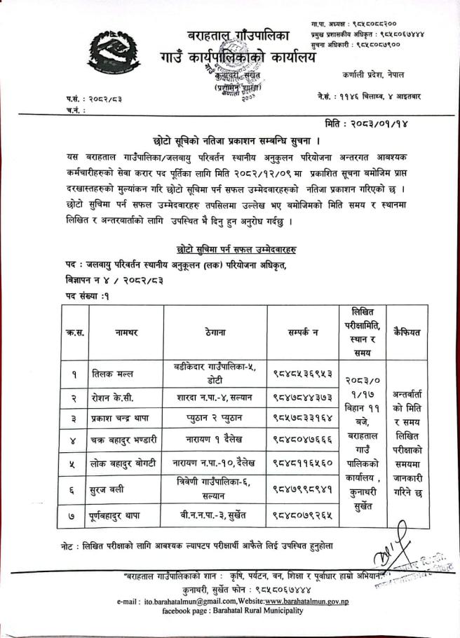 LACC परियोजनाको छोटो सुचिको नतिजा प्रकाशन गरिएको सम्बन्धमा ।