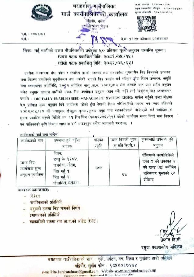 गहु बालिको उन्नत बिउमा ५०% अनुदान सम्बन्धी सुचना ।।।