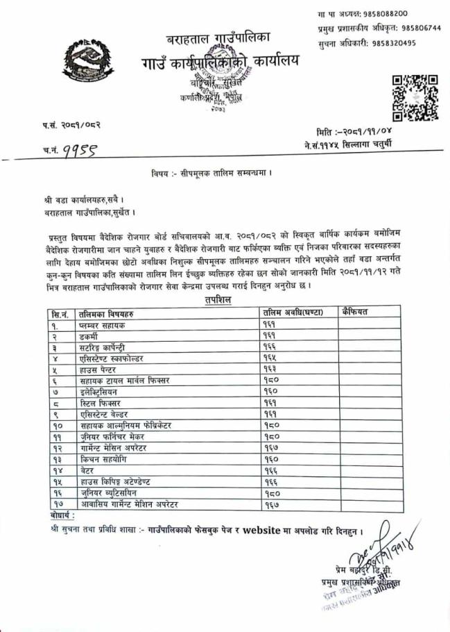 निशुल्क शिपमुलक तालिमको लागी आवेदन दिने सम्बन्धि सुचना ।।