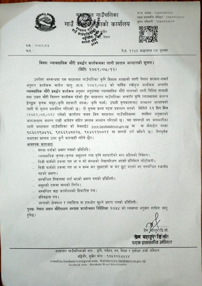 व्यावसायिक मौरी प्रवद्धन कार्यक्रमका लागी प्रस्ताव आह्वानको सूचना ।।।